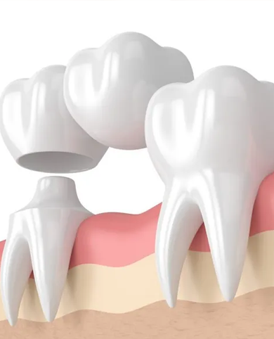 While a crown is used to cover an existing tooth, a dental bridge is used to fill in the missing space caused by one or more lost teeth. A bridge is made up of one or more false teeth with one crown on either end of the bridge.