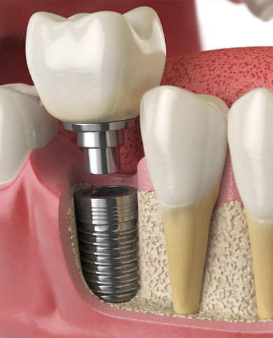 Dental implants are artificial tooth roots used as a permanent replacement when one or more teeth have been lost. Implants are small titanium screws that are placed directly in the jawbone, acting as a stable support for replacement teeth in the shape of crowns, bridges or secured dentures.